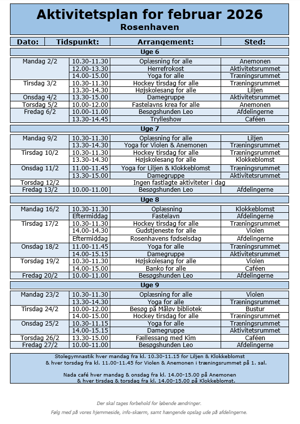 Vi har ugenlige aktiviteter på Rosenhaven, som gælder for beboer- og pårørende, med tilknytning til plejehjem Rosenhaven.
