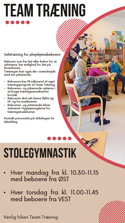 - Beboerne kan få udleveret sit eget træningensprogram af Team Træning.